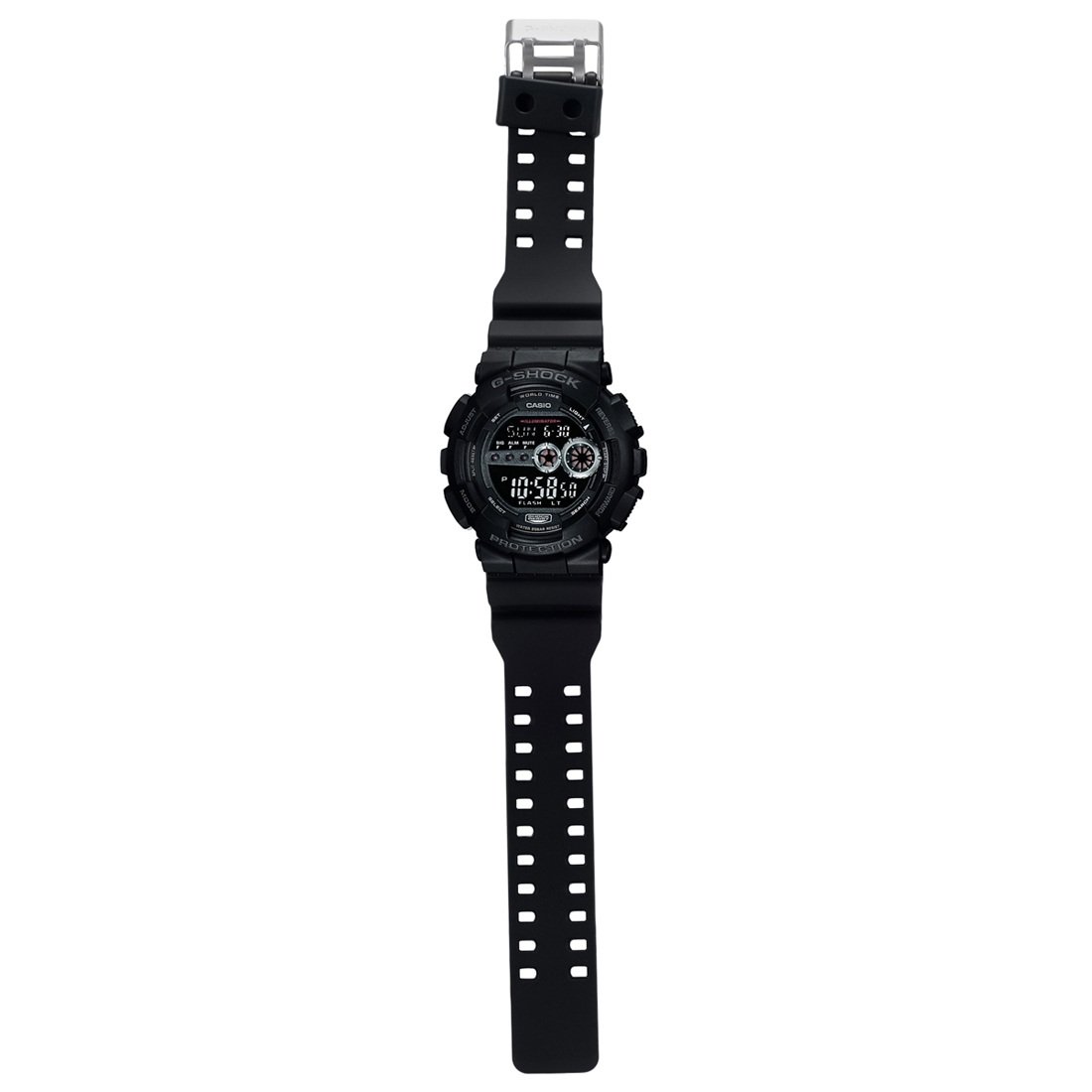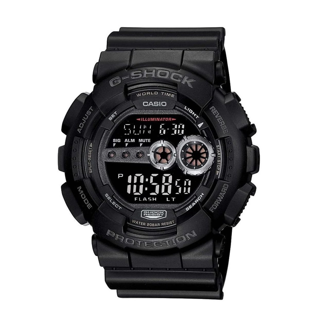 El Casio G-Shock GD-100-1BCR es un reloj digital resistente, funcional y con diseño moderno, perfecto para uso diario, deportes y actividades al aire libre. Tiene hora mundial, cronómetro, temporizador, alarmas múltiples, luz LED automática y calendario automático hasta 2099, además de ser resistente a impactos y al agua hasta 200 m.