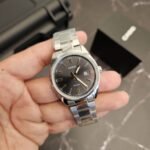 Reloj analógico elegante con acero inoxidable, esfera negra tipo sunray y diseño clásico.